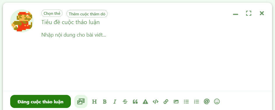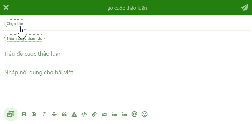 Diễn đàn hoạt động dựa trên hệ thống gán thẻ (còn gọi là Tags). Thẻ rất quan trọng vì nó sẽ giúp hệ thống phân loại và hiển thị bài viết của bạn đúng trong những mục được gán thẻ. Click vào nút chọn thẻ để gán thẻ cho bài viết. Bạn không thể đăng bài nếu không chọn thẻ cho bài viết.