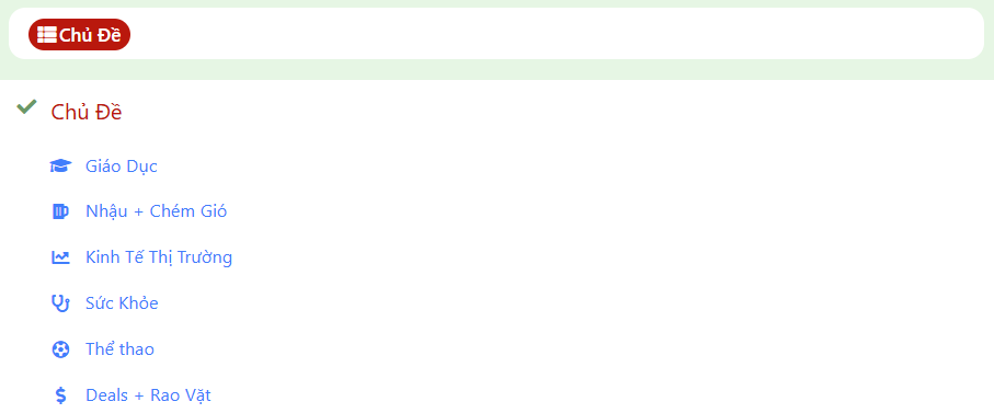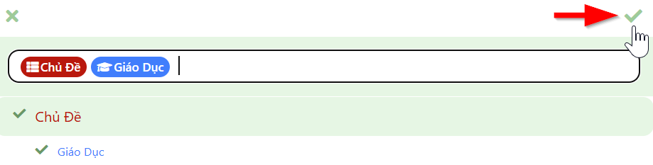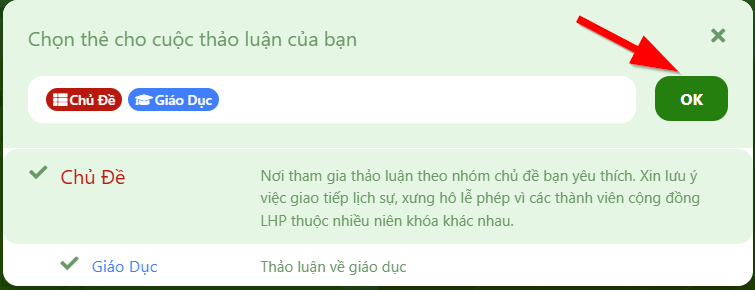 Trường hợp danh sách có thẻ phụ, bạn chọn thêm thẻ phụ cho phù hợp với nội dung bài viết của mình. VD, bạn muốn tạo chủ đề thảo luận về việc học thêm tiếng anh của con mình, bạn sẽ chọn thẻ "Chủ Đề" và thẻ phụ "Giáo Dục"